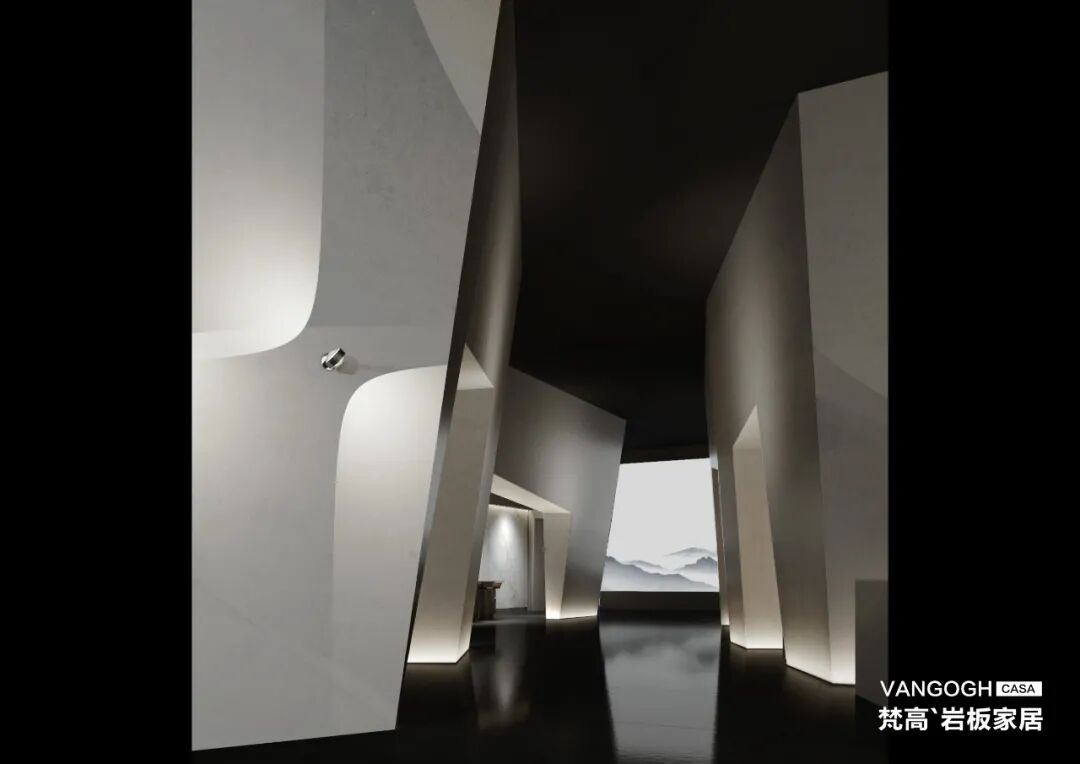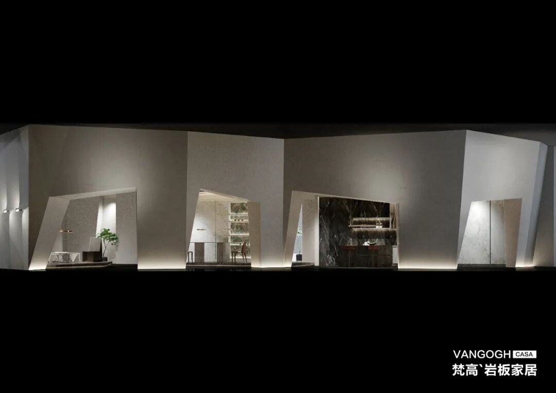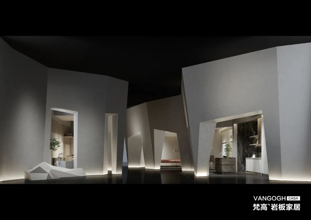 由梵高`岩板家居全新策划和建造的【快闪美术馆】,不仅是梵高对展位设计的全新尝试,也是2021梵高总部美术馆的Demo版本。在这里,梵高岩板厂家将以【山水人居】的深度诠释,回应观众们对未来理想人居的探寻。由外而内,自然的元素无处不在。外观上,梵高【快闪美术馆】以人类建筑起源形态【洞穴】为创意,整体划分为四大不规则的组团,内外形成环绕遮蔽的形态,成为一个极具张力的艺术装置,向观众们发出【岩板】诗境生活的隐喻和邀请。